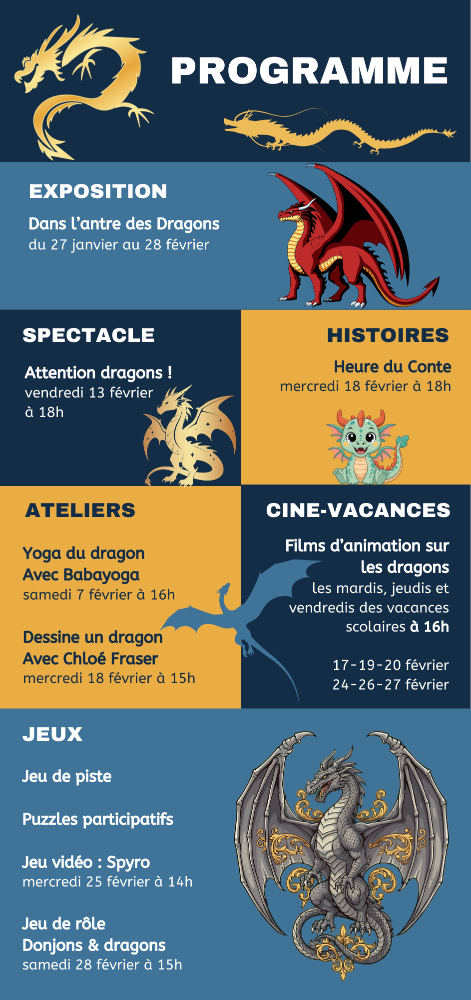 La médiathèque vous propose d’explorer cette créature fascinante à travers cette nouvelle exposition « Dans l’antre des dragons », enrichie de nombreuses animations : un atelier avec Baba Yoga, un spectacle proposée par le spécialiste des dragons Cyril Guillou, du dessin avec l’illustratrice Chloé Fraser, une découverte du célèbre jeu vidéo « Spyro », des projections de films cultes… Ainsi que de nombreuses surprises. Et bien sur nos rendez-vous réguliers, mis aux couleurs des dragons : l’heure du conte, le café lecture, les jeux…